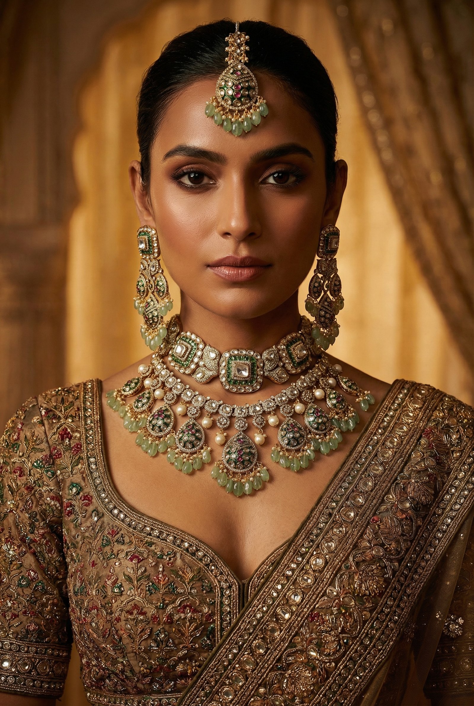 Dazzle in this regal jewelry set featuring a stunning necklace, matching earrings, and an elegant maangtikka. Adorned with brilliant Moissanite Polki, sparkling cubic zirconia diamonds, and captivating ruby semi-precious stones, this ensemble showcases intricate meenakari craftsmanship with an exquisite antique polish. Finished with delicate mint green hangings, it’s the perfect statement piece for brides, festive occasions, and grand celebrations.