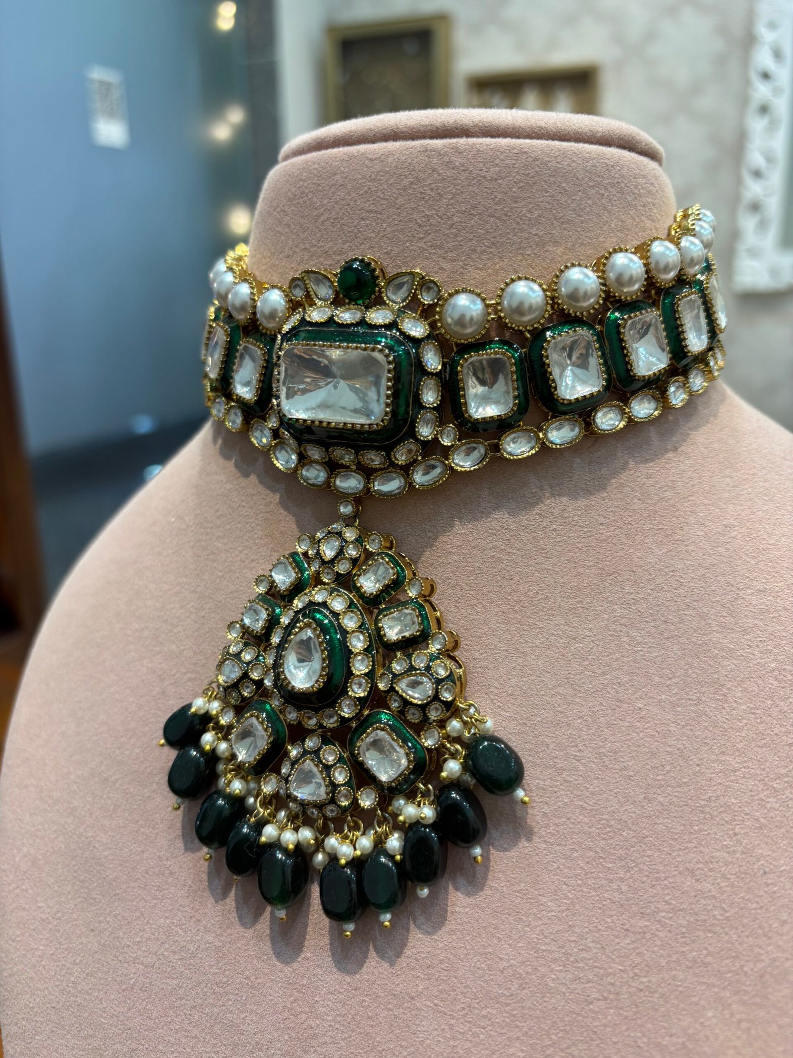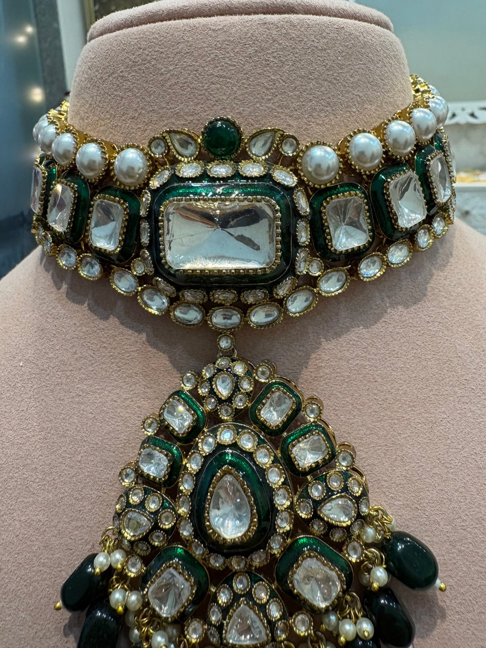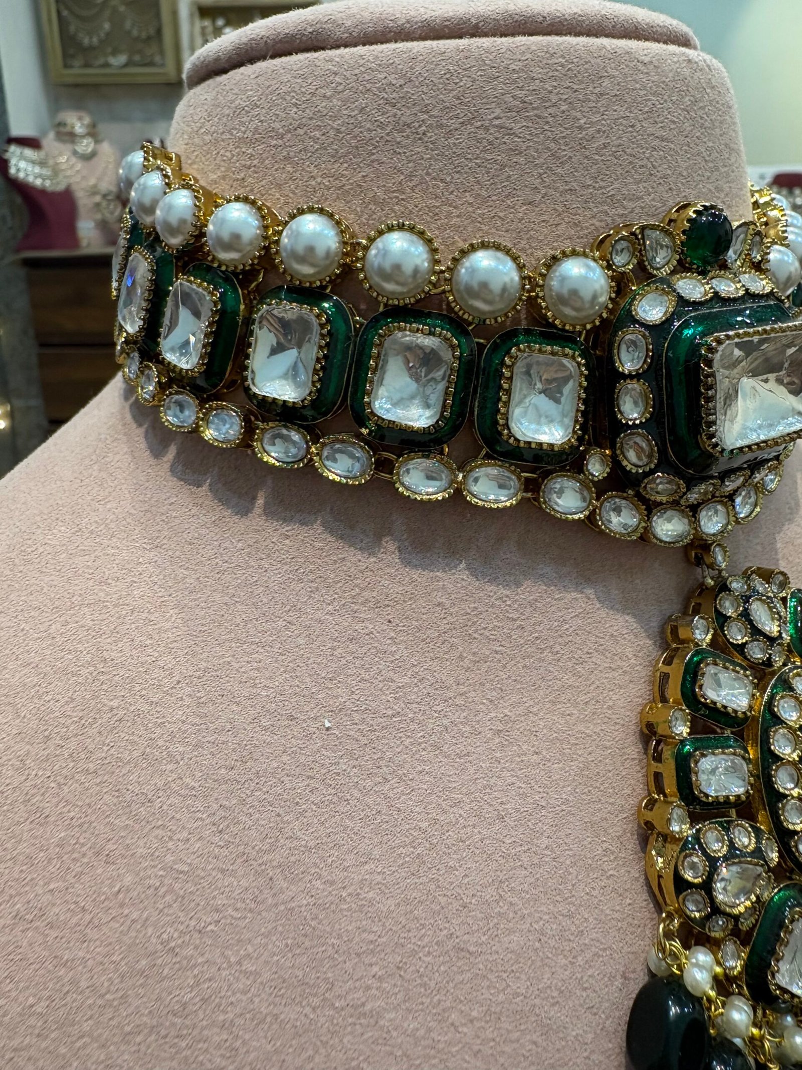 This exquisite choker is a timeless and versatile jewelry piece, perfect for a variety of occasions. Adorned with radiant Moissanite Polkis and Bikaneri Kundan, it showcases intricate green meenakari work that elevates its elegance. The design is beautifully complemented by stunning emerald-green drops and clusters of pearls, radiating sophistication.
