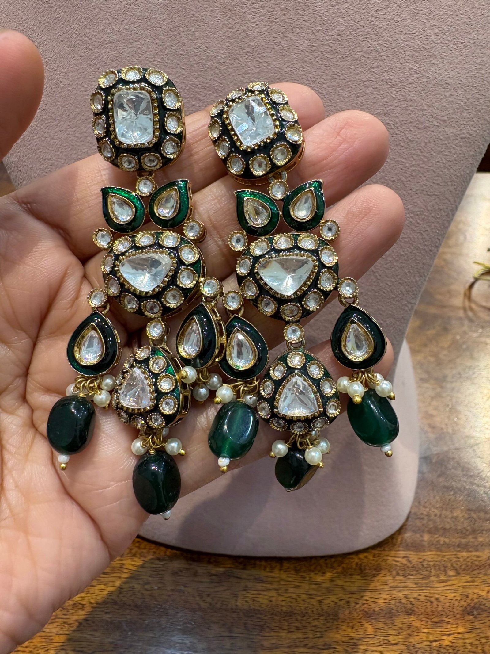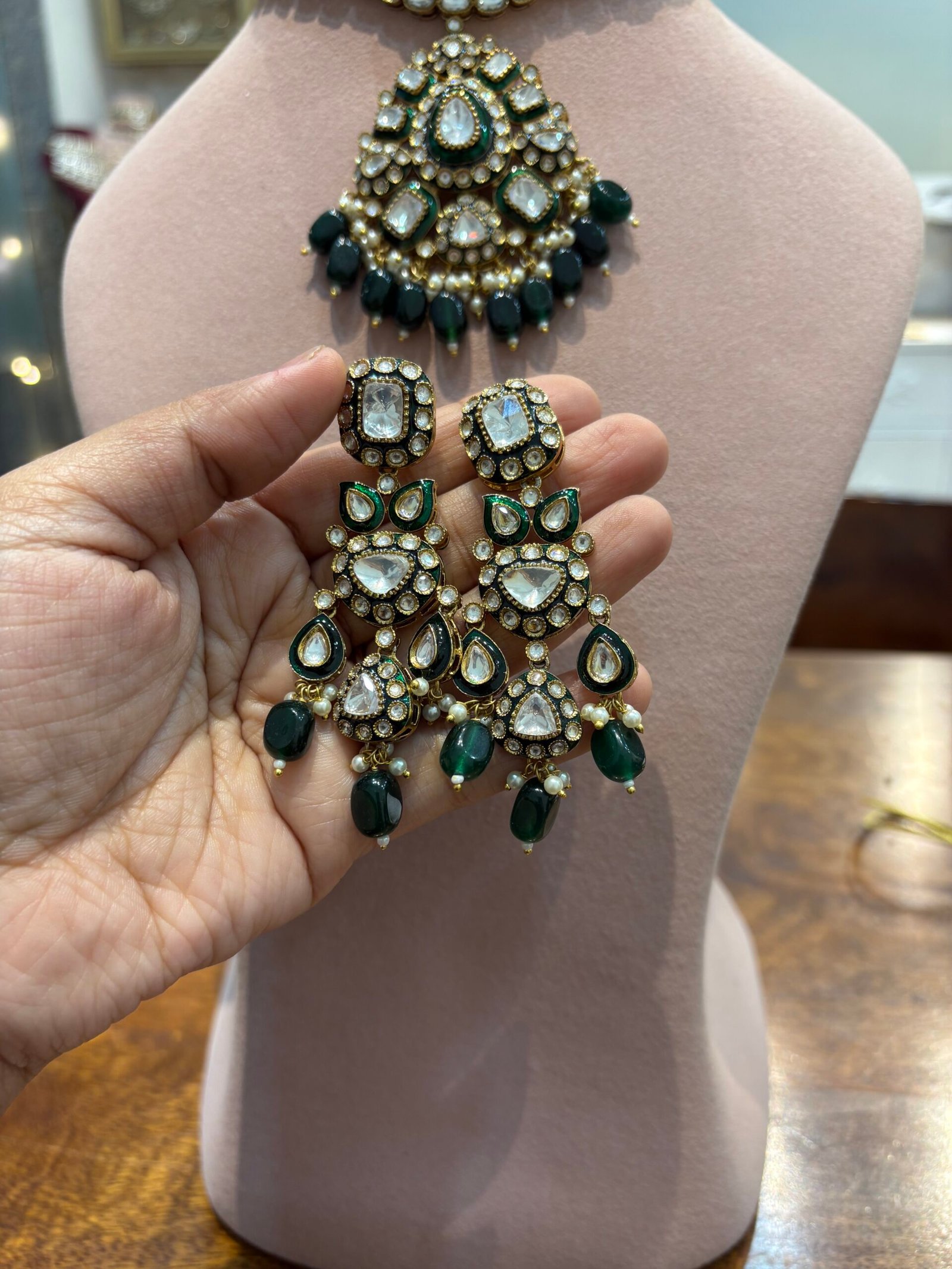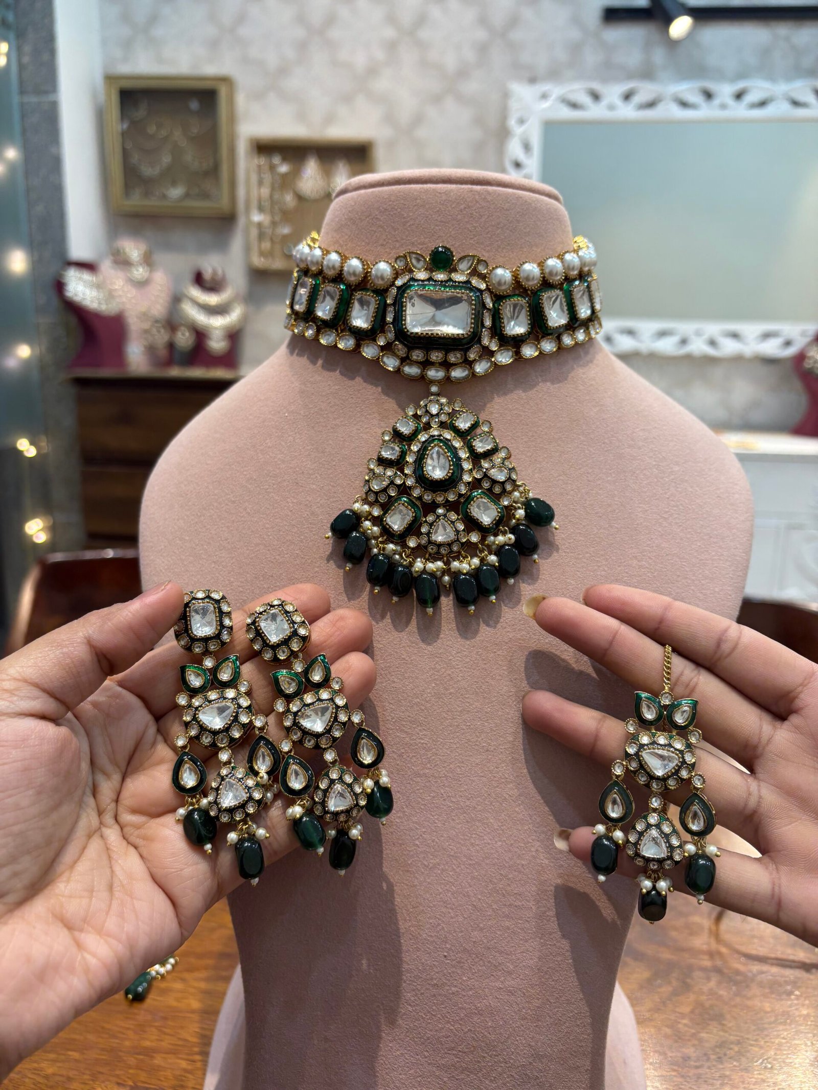 This exquisite choker is a timeless and versatile jewelry piece, perfect for a variety of occasions. Adorned with radiant Moissanite Polkis and Bikaneri Kundan, it showcases intricate green meenakari work that elevates its elegance. The design is beautifully complemented by stunning emerald-green drops and clusters of pearls, radiating sophistication.